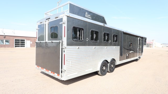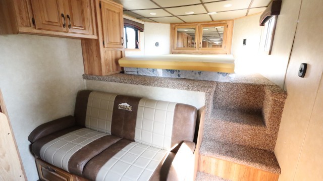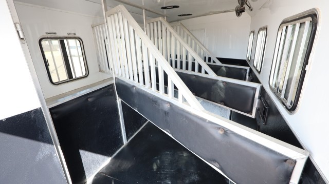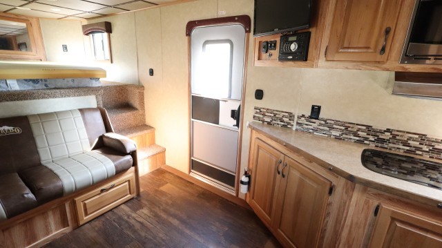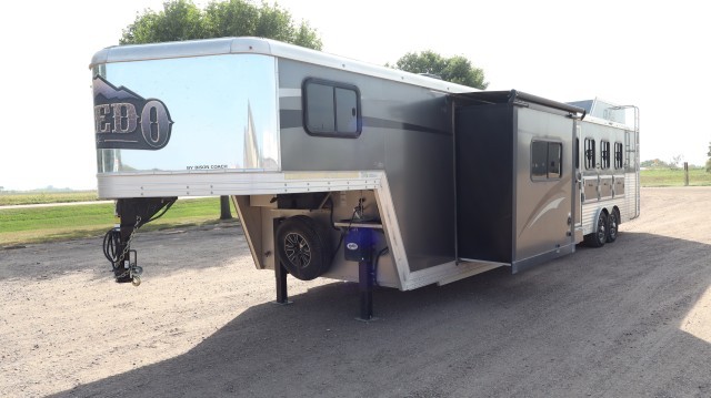Pull Home. Loaded Up Top Of The Line Bison Coach Laredo M-8415 44' 4 Horse Trailer with Spacious Living Quarters That Includes One Power Slide Out, Queen Bed with Overhead Closet Space, Pull Out Sofa - That Folds Into A Bed, 4 Person Dinette - That Folds Into A Bed, LED Interior Lighting, Suburban 2 Burner Stove Top, Deep Dual Sink, High Pointe Microwave, Dometic Refrigerator with Overhead Freezer and Dometic Duo-Therm Heater and AC Unit. The Bathroom Includes Sink, Vanity, Toilet and Walk In Shower. The Horse Stalls and Tack Room Includes Saddle Boss Racks, LED Interior Lights, 4 Horse Fans, Bridal Hooks, Brush Box, Collapsible Rear Tack Wall, Aluminum Air Flow Dividers, Lined and Insulated Ceiling and Escape Door. Exterior and Interior Jensen Surround Sound Speakers, LED Lighting, Power Awning, Hydraulic Jack, Rear Ramp Door and Upper Hay Rack. Fix or Leave "As-Is"!! Clean!! Sharp!!